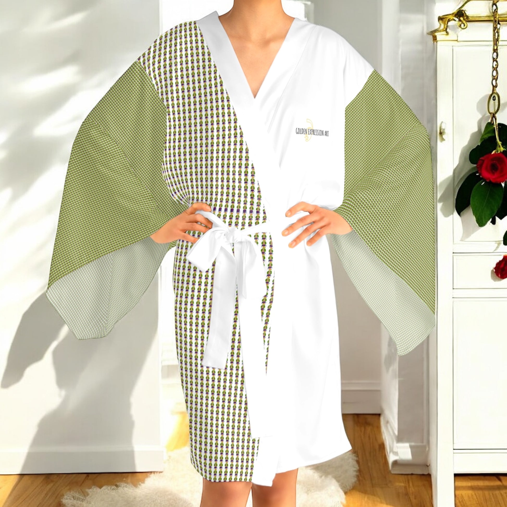 Whether it’s lounging at home or making a stylish appearance, this kimono-style robe are as beautiful as they are cozy. With a figure-flattering shape, this chic mid-length robe features the signature flowing bell sleeves and a belt, making it an absolute delight for Japanese style enthusiasts.